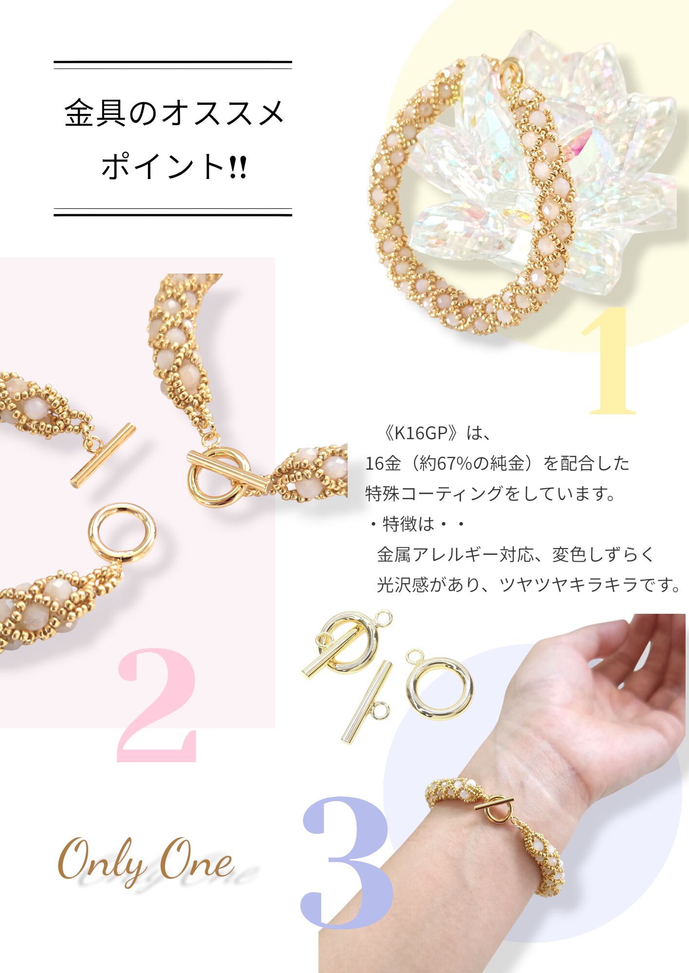 ・特徴は・・金属アレルギー対応・変色しずらく、光沢感があり、ツヤツヤキラキラです。